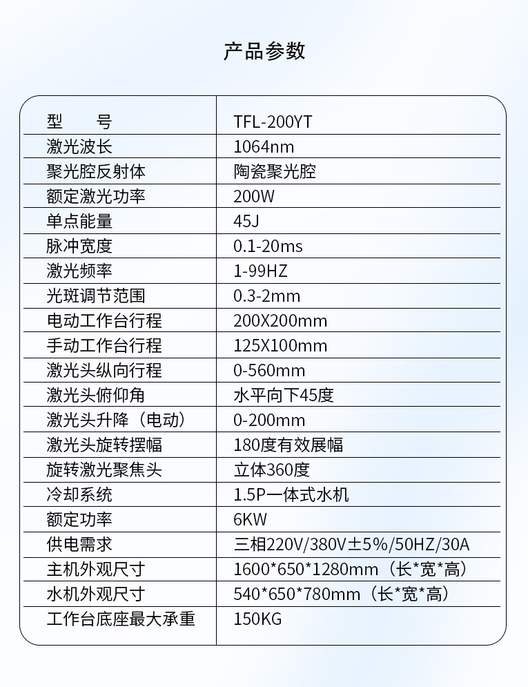 環(huán)境溫度:攝氏4度-攝氏32度。設(shè)備運(yùn)行時(shí),環(huán)境溫度不可以超過(guò)攝氏32度,因?yàn)榧す怆娫床糠郑β屎芨撸恍┕β势骷\(yùn)行時(shí)發(fā)出熱量需要及時(shí)散發(fā)出去,而環(huán)境溫度太高會(huì)導(dǎo)至不能正常散熱,會(huì)引起整個(gè)系統(tǒng)的工作不穩(wěn)定,甚至損壞。而冬天的時(shí)候,需要嚴(yán)防冷卻水結(jié)冰,因?yàn)榧す饩w、氙燈、聚光腔都充滿了水,結(jié)冰會(huì)直接導(dǎo)致這些器件的損壞。冬天時(shí)如長(zhǎng)時(shí)間不運(yùn)行情況下,將腔內(nèi)的水排空;如再開機(jī)前,先重新加水,打開電源空氣開關(guān),先行主機(jī)不開,只開水機(jī)空機(jī)運(yùn)行10分鐘,等水溫回復(fù)到攝氏4 度以上,再開主機(jī)。(強(qiáng)烈要求不能將設(shè)備放于室外或者低溫結(jié)冰的情況下使用,否則極易損壞設(shè)備)